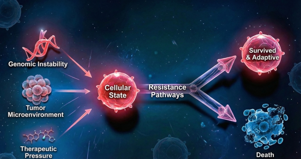 We investigate the roles of somatic copy number aberrations, the tumor microenvironment, and various signalling pathways in both pre-existing resistant states and treatment-induced, potentially adaptive patterns.